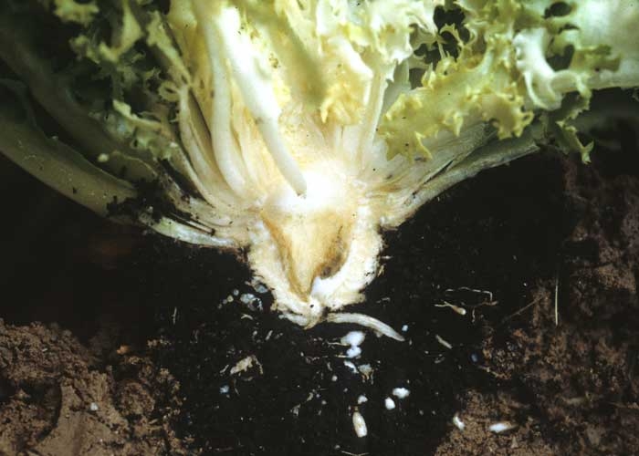 Assez généralement, lorsque des salades présentent une ou plusieurs feuilles qui flétrissent et/ou se dessèchent, les producteurs et les techniciens confrontés à ces symptômes ont tendance à focaliser leur attention uniquement sur les feuilles et à vouloir absolument y trouver la cause de cette manifestation. Dans la majorité des cas, l'origine d'un flétrissement doit être recherchée ailleurs que sur le feuillage. C'est plus communément sur les racines, le collet, à l'extérieur ou à l'intérieur du pivot et de la tige que l'on trouvera la cause de ce flétrissement (figures 1 à 5).