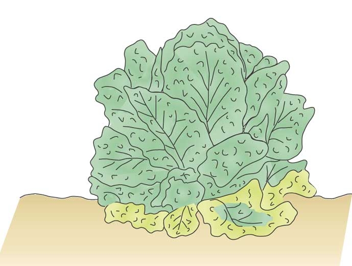 Plusieurs minéraux peuvent provoquer des symptômes de carences, apparaissant d'abord sur les feuilles basses (figure 1) et se généralisant ultérieurement à l'ensemble des feuilles des salades.