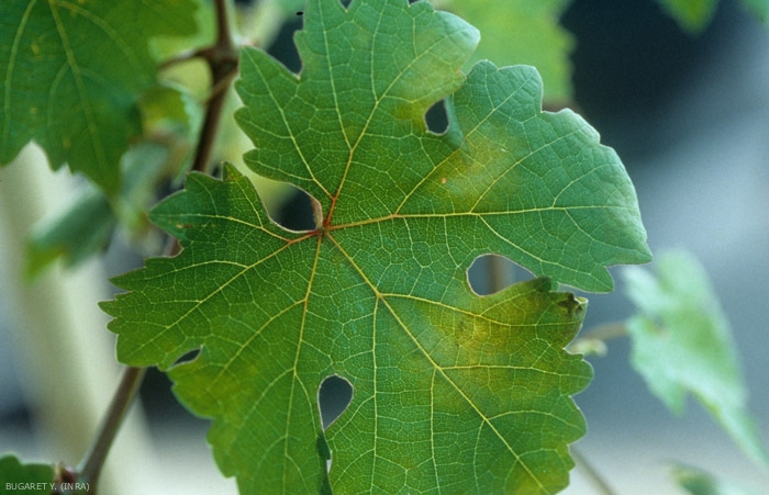 Some grape varieties showing partial resistance to downy mildew can express symptoms with different facies. To see the particular forms that mildew can take on resistant grape varieties, consult the website of the national observatory of resistant grape varieties OSCAR .