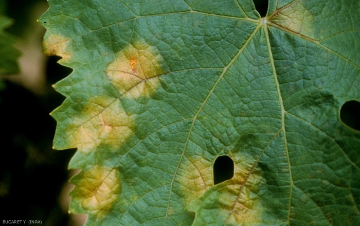 - spots of limited extension, polygonal in shape because limited by the veins, more or less chlorotic to necrotic (rather on old leaves). This rather particular facies, which appears later, is at the origin of the name: " mosaic mildew " or "tapestry stitches" (figures 6 to 8).