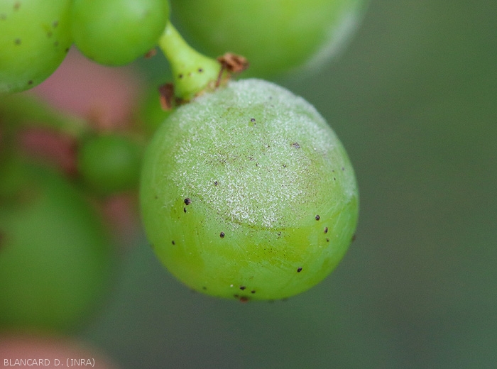 The severity of powdery mildew attacks on berries is very dependent on the intensity and precocity of the infections occurring after flowering. It should be added that the development of E. necator is gradually reduced as the sugar and anthocyanin content of the berries increases.