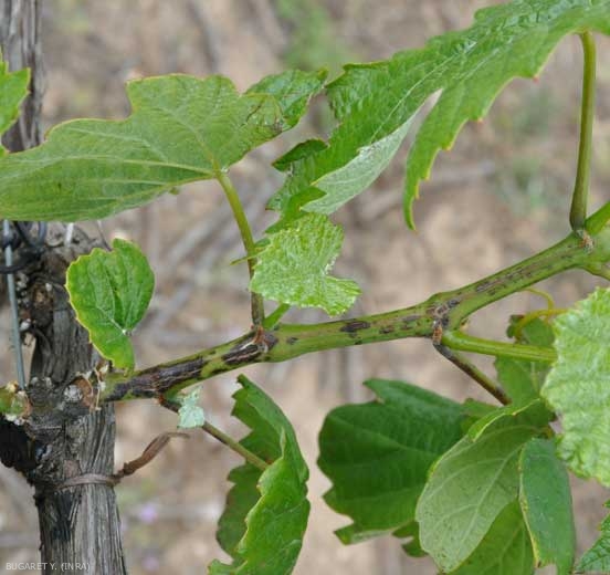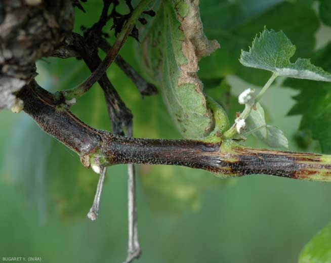 Lesions appear on the first internodes at the base of young shoots, often at the level of the lenticels. They are of limited size, elongated in shape, and initially dark in color (figure 1); they turn brown and black subsequently showing bluish reflections (Figure 2). These necrotic lesions frequently become chancery, the central tissues of the cortex thinning and cracking more or less in width (Figures 3 to 7). This last phenomenon is amplified during a period of rapid growth of the vine. Similar lesions can be observed on the petioles and peduncles of inflorescences and racemes. These can lead to the dieback of the bunch, which is then no longer fed, or weakly (figure 8).