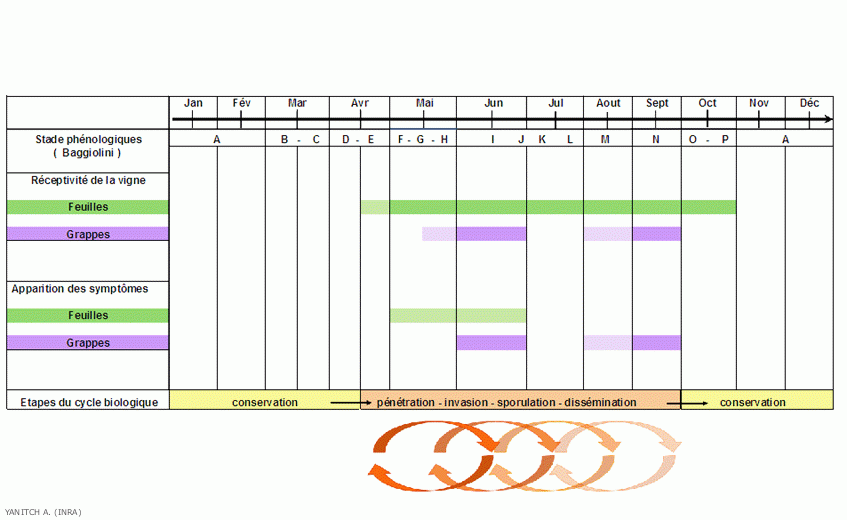 Botrytis cinerea is sometimes found on seeds. It is able to maintain itself in the soil on the most diverse plant debris, this in several forms: conidia, mycelium and sclerotia (figure 1). The latter form on the branches and sometimes on the mummified berries, or even the stems in the fall, which allows this fungus to remain on the vine during the winter. Its mycelium, present in the bark and dormant buds, also performs this function. Let us add that the sclerotia are also able to persist in the soil for several years. In addition, the saprophytic potential of Botrytis cinerea allows it to be easily preserved on organic matter. This polyphagous fungus is also likely to attack and colonize several hundred cultivated plants or weeds which contribute to its conservation and constitute potential sources of inoculum.
