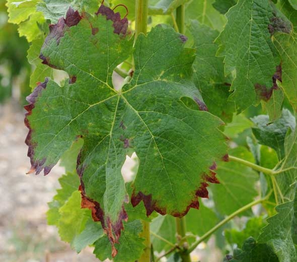 The discoloration begins at the periphery of the blade, it is blocky in shape and is delimited by the veins. The blade tends to curl slightly. Subsequently the leaves become necrotic and dry out.