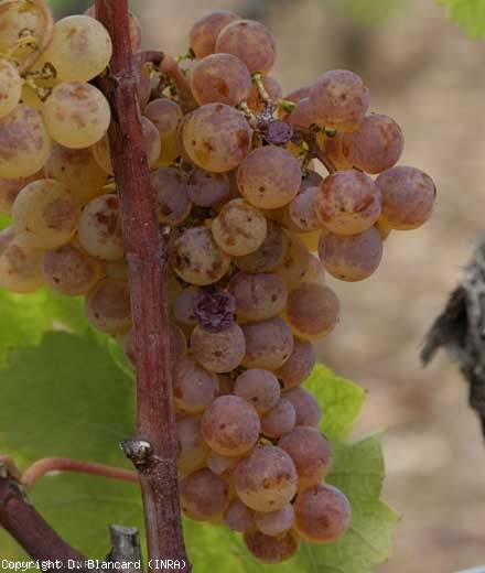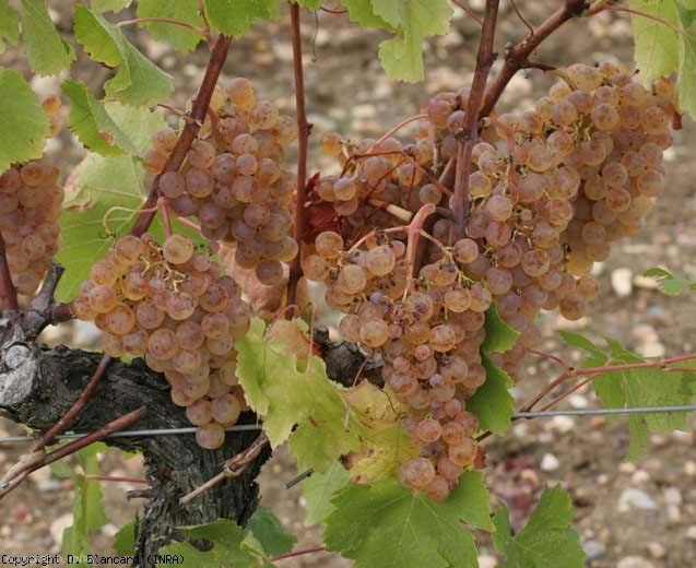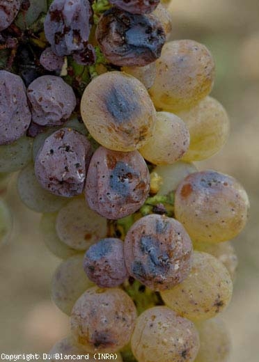 Botrytis cinerea , agent of gray rot (figures 1 and 2), is capable under certain climatic and water supply conditions of the vine to develop in a particular form called " noble rot ". The latter is at the origin of great syrupy white wines French , in particular those of the South-West (Montbazillac, Sauternes) made from Sémillon (figures 3 to 7) and sauvignon (figures 8 to 17), or selections of grains. noble Chenin de Loire or even Gewurztraminer, Pinot Gris and Riesling d'Alsace. It is also associated with certain German, Austrian, Hungarian or Swiss productions in Europe.