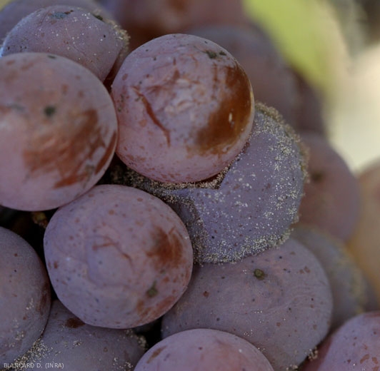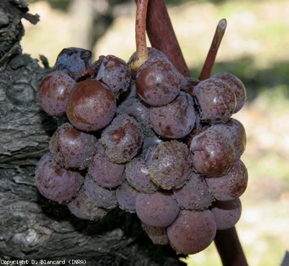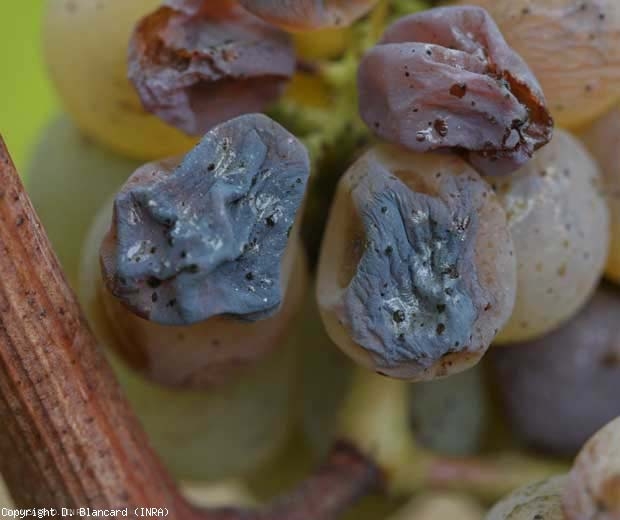 Before this botrytization process , the grape berries are golden, with thick skin, slightly pigmented with brown. Under the action of Botrytis , they then take a chocolate brown hue, then turn purple or even midnight blue before wilting. We then say that the grape is "roasted". These transformations are due to a significant loss of water, but also to an intense enzymatic maceration of their skin. By way of example, remember that the pectinase activity observed in a rotten berry is about a hundred times greater than that measured in a healthy berry.