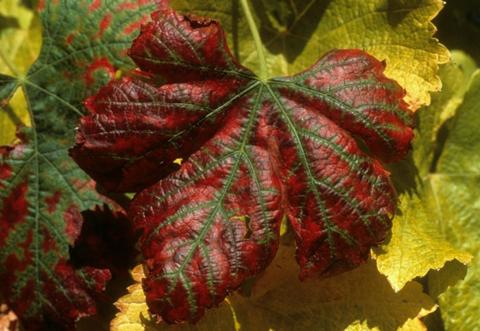 Reduction in the vigor and vitality of the strains. Leaves : discoloration of the blade varying from yellow to red-orange depending on the grape variety (figure 5). Falling leaves. Roots : early maturity, quite premature. Berries : reduction in ripening and quantity. |