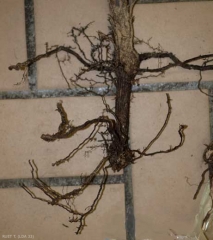 Two very specific symptoms can be observed on the underground organs of the vine: