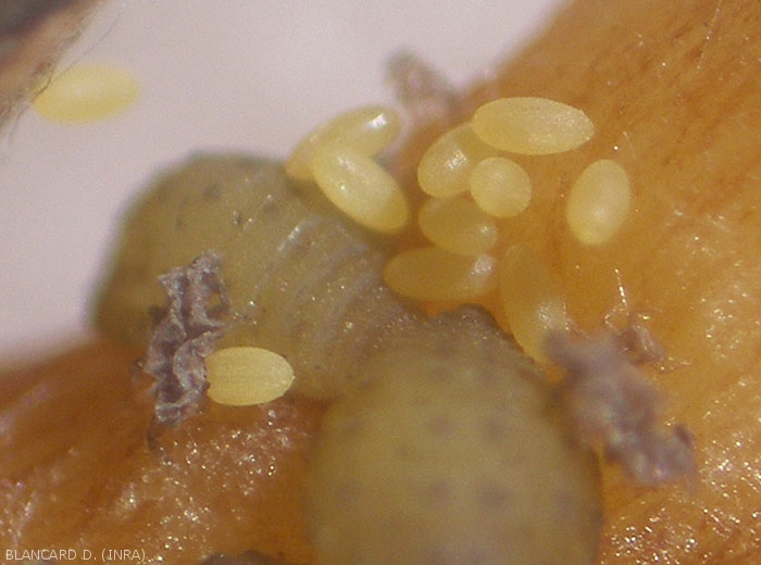 - the gynopares producing female eggs large. The laying will take place under the leaves or on the bark. These eggs will give the sexual forms. After fertilization, females will lay a single winter egg fixed by a peduncle in the crevices of the bark. In the spring, the egg will hatch to give an parthogenetic founder wingless of the epigeal cycle.