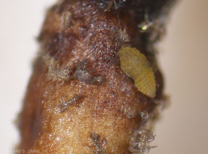 - The epigeal cycle takes place on the aerial organs of the vine, in particular on the non-lignified organs of the plant. The foundresses hatch winter eggs in early spring. They colonize the apical leaves via their upper surface and the edge of the blade, and form galls. The first larval instar is mobile, light yellow in color and conical in shape. Throughout her life, the founder will lay 550 to 600 yellow eggs (figure 1) with a smooth or reticulated surface.