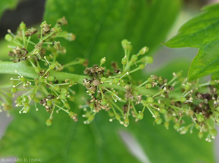 Circular and slightly concave brown spots appear on the young berries disrupting their growth (Figure 14). They have the shape of a bird's eye (the Anglo-Saxons speak of bird's eye rot); sometimes lighter in their center, they have a rather purplish black color on the periphery. When attacked early, young clusters can turn black and dry out (Figures 15-17).