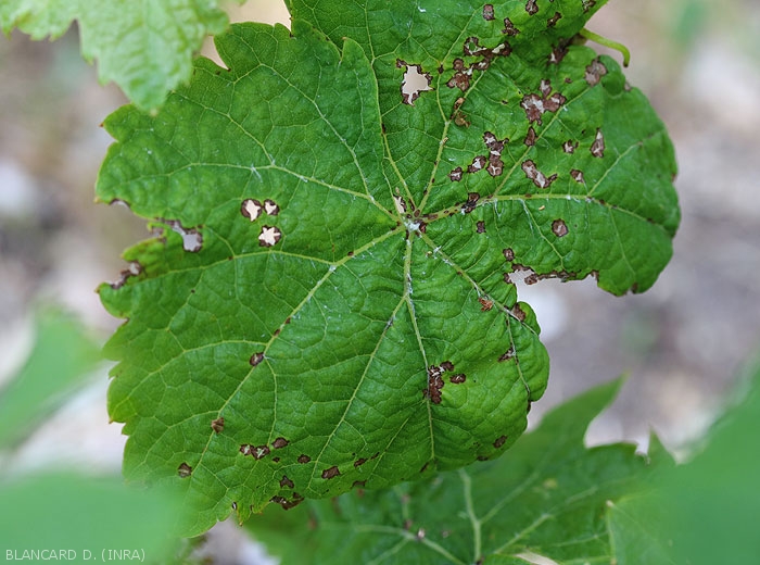 These spots are often localized along the veins (Figure 2). At the end of the development, the central tissues tend to necrosis, lighten (greyish-white coloration) (figure 6) and dry out. They eventually fall off, giving the blade a riddled appearance (Figure 7). On young leaves, when numerous lesions develop along the veins, more or less severe leaf deformations and / or mortalities may be observed.
