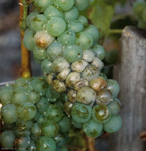 Rhizopus stolonifer rots berries very quickly. These turn brown on red grape and / or take on a beigeish tint on white grape (figure 1).