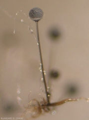 The sporangiophores brown are isolated or gathered in sparse tufts. Up to 3.5 mm long and 20-34 µm wide, these structures, at the end of which are the sporangia , are easily visible with a binocular magnifying glass. The sporangia appear as black globular vesicles with a diameter of between 40 and 350 µm, with a flattened base.