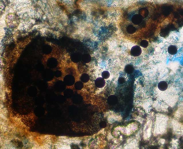 M. cannonballus forms spherical and black perithecia (measuring between 40 and 50 µm in diameter) in root tissues (Figures 1 to 4 and 7), this late in the season after harvest or plant death. At maturity, these structures contain numerous asci each containing a spherical ascospore (Figures 4 to 6, 8 and 9). Several hundred thousand ascospores could be produced and released from a root system of a diseased melon plant. These ascospores are distributed vertically and horizontally in cultivated soils in a uniform manner. Their number is still higher in the superficial soil stratum.