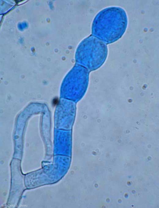 Within 4-7 days of infection with these fungi, short conidiophores develop on secondary hyphae on the leaf surface and produce chain conidia. The sporulation can be more or less abundant depending on the host and the climatic conditions.
