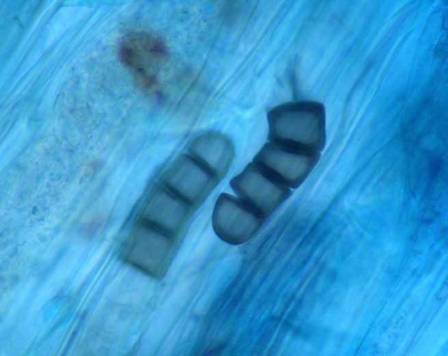 Arthroconidia (chlamydospores) (figures 4 and 5), typical of Thielaviopsis basicola , are visible on and in the root tissues; they allow it to be identified with certainty.