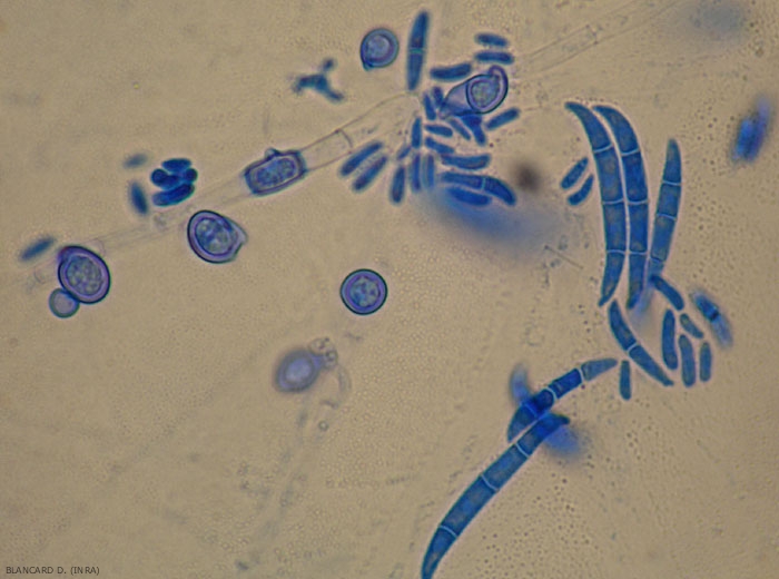 Fusarium oxysporum f. sp. melonis is a soil fungus capable of sustaining itself in the soil for many years. It can be preserved there in the absence of melon culture, on the most diverse plant debris, thanks to its chlamydospores (figure 3), conservation spores with thick and resistant walls which form on the mycelium or macroconidia. It seems endowed with aptitudes for saprophytic life which allow it to colonize and survive from various organic compounds; it would be able to colonize most of the crop residues entering in rotation with melon. It seems to keep on seeds: on the surface, more rarely inside melon seeds.