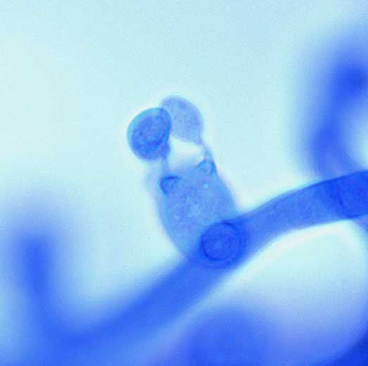 Contamination takes place through the mycelium (figure 2) present in the soil or from the sclerotia (figure 3). This can superficially colonize all the organs of the melon present in the soil or in contact with it. To our knowledge, no contamination involving basidiospores (figure 4) has been reported on melon. Subsequently, the mycelium enters the tissues directly through the cuticle or through various injuries. Its inter and intracellular evolution is often very fast and destructive because of its enzymatic equipment, but also if it encounters favorable climatic conditions. This parasitic process is at the origin of damping-off of seedlings, lesions and rots visible on the various organs of the melon.