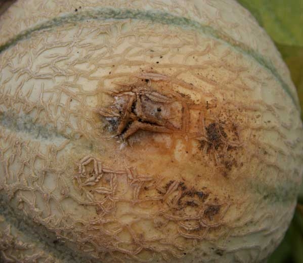 It causes elongated lesions on the stem starting from senescent or injured tissues (aborted fruits, tendrils, floral parts, senescent leaves, etc.). These can be located near the crown or higher up on the plant, especially when the melons are trained. They have a damp and dark appearance (Figures 1 to 5), and they end up girdling it several centimeters. Of exudates sometimes brown gummy bead (figures 2 to 4). Note that on the distal part of the girdled branch, the leaves can turn yellow, wilt and dry out.