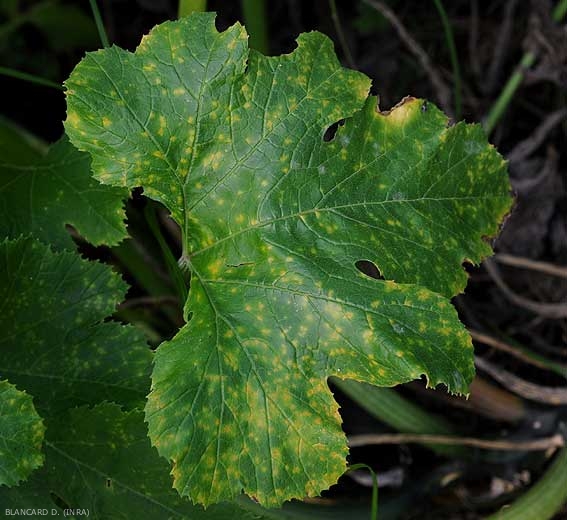 - on some cucurbits, such as cucumber and zucchini , the spots are mainly angular because they are delimited by the veins, which gives the blade a mosaic appearance (figure 6). Thus, the leaves eventually show a mosaic of yellow and / or brown spots if the lesions are necrotic. These pseudo-mosaics should not be assimilated to those caused by viruses;