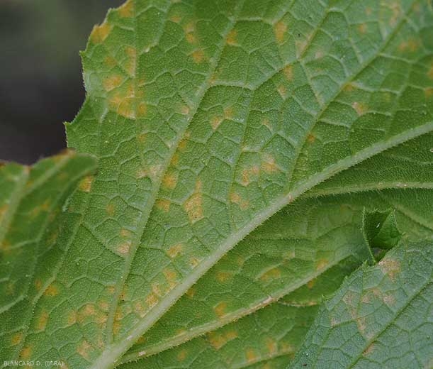 Pseudoperonospora cubensis grows mainly on the leaves of cucurbits. It causes leaf spots more or less wide which may present some common points but also some differences, this depending on the parasitized species and the climatic conditions in particular: