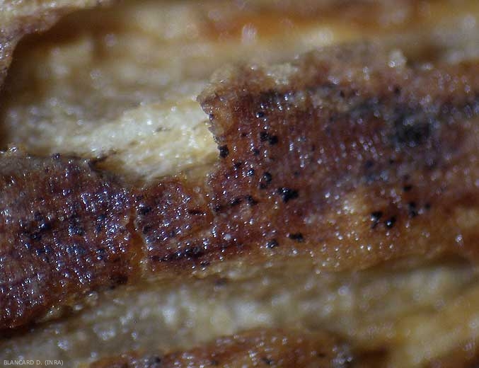 On the root lesions, black lines are observed locally ( pseudo-stromas ) (figure 8), more or less thick and with irregular contours surrounding areas of tissue. In certain portions, it is sometimes more difficult to discern numerous greyish-black to brown pits distributed in a “mosaic” in place in the cells of the cortex. These are the pseudo-microsclerotia (figures 9 and 10) of this fungus.