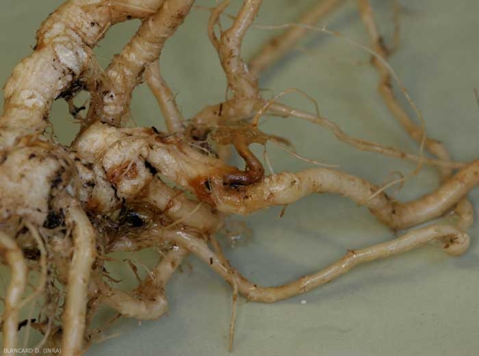 After having pulled up and carefully washed the root systems of a few diseased plants, we see that they are more or less altered (figures 1 to 4), rotten, locally suberized. Some roots have disappeared and those which remain show more or less extensive reddish-brown necrotic lesions (figures 5 and 6), some are more or less corky (figures 3, 4 and 7). The root tissues end up rotting and decomposing, which ultimately means that the root systems are very reduced.