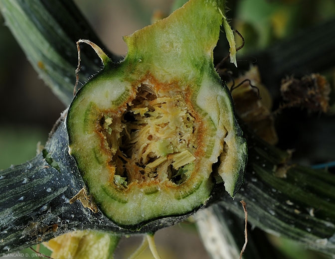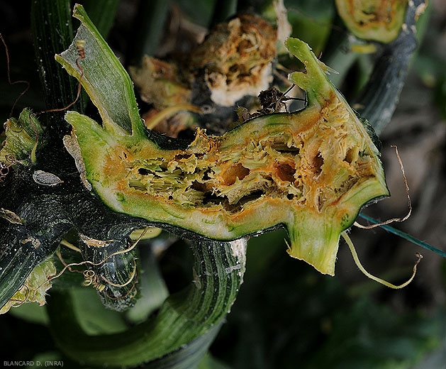 Pectobacterium carotovorum subsp. carotovorum mainly attacks stem the zucchini , and develops particularly inside it. To realize this, it is advisable to make a cross section (figure 1) or longitudinal (figure 2) to see the devastating effects of this bacterium. There are moist, brownish to orange lesions, and numerous cavities associated with local liquefaction of internal tissues. Rot can spread to the outside of the stem, a dark brown to blackish lesion extending and surrounding it over a longer or shorter length. Ultimately, the tissues end up decomposing and liquefying, only the vascular system remains (figure 3).