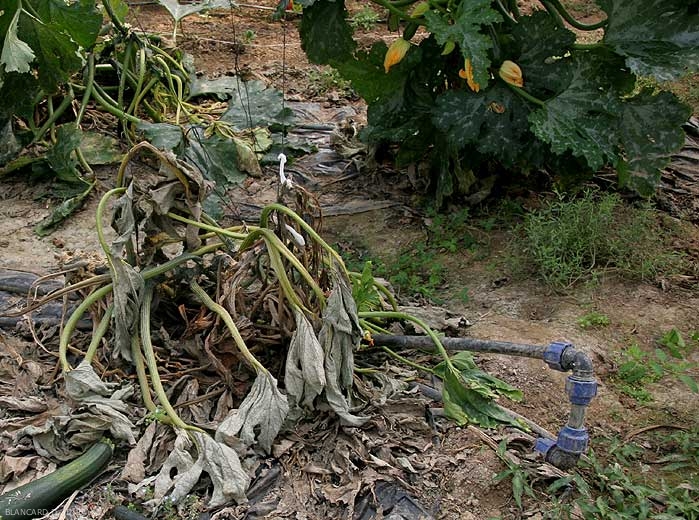 The internal deterioration of the stem is not without consequences on the functioning of the zucchini plants, and in particular on the transport of water and mineral elements. This is limited or even interrupted in the long term, which leads to yellowing and leaf wilting (figure 4), and the collapse of the plants (figure 5), in particular during hot climatic periods. If conditions are right, the disease progresses and plants can die (Figure 6).