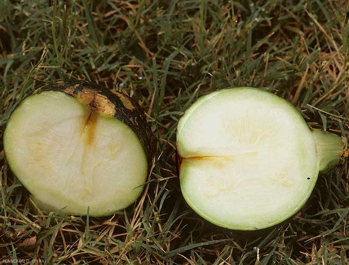 When it invades the fruit , this bacterium causes a rapidly evolving wet rot . Moist and soft tissues show a dark brown to blackish tint (Figures 10 to 11). Let us note that the invasion of the fruits is carried out preferentially starting from the stylar scar (figure 12), and that the rot extends inside; eventually the squash can rot completely (Figure 13).