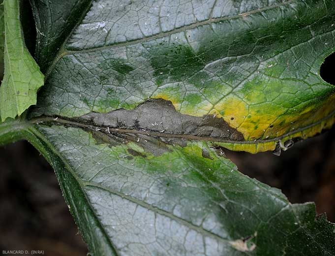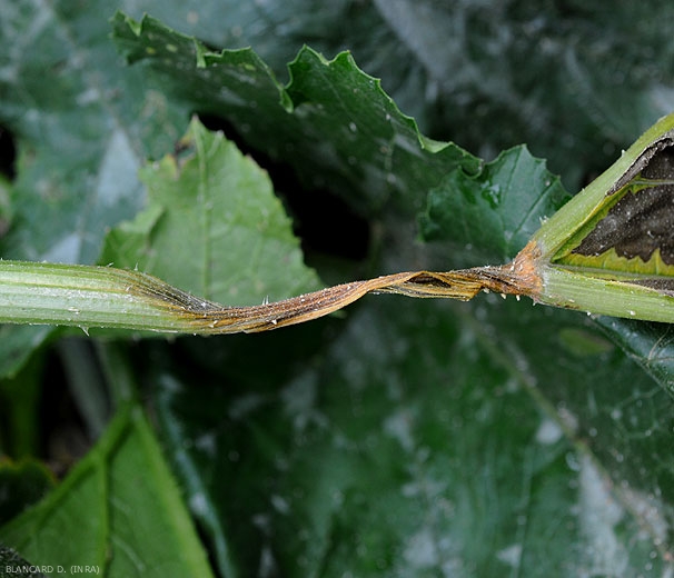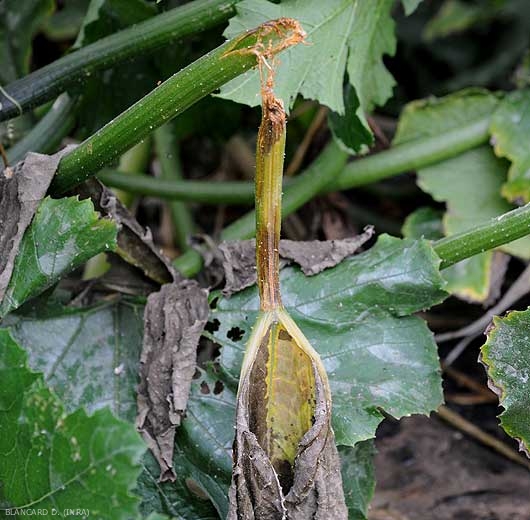 Symptoms can also be seen on the leaves and petioles of zucchini and squash. Blackish moist lesions form on the leaf blade, surrounded more or less by a large chlorotic halo (Figure 7). Sections of the petioles are sometimes surrounded by wet rot, eventually leading to a disruption of leaf feeding, and therefore their drying out (figures 8 and 9)