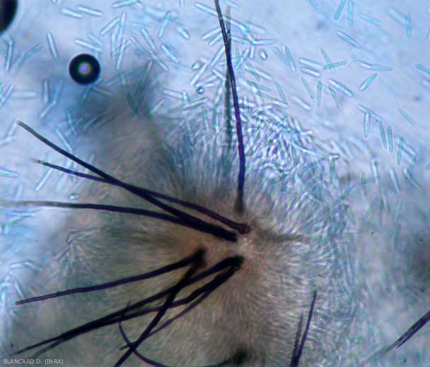 As previously stated, C. orbiculare produces in about five days, weather permitting, acervuli (Figures 2 and 3) on leaf lesions or on those localized on stems and fruits. These structures, materializing its asexual reproduction, generate abundant conidia (13-19 x 4-6 µm) (figure 4) grouped together in the form of a mucus which are disseminated in different ways: