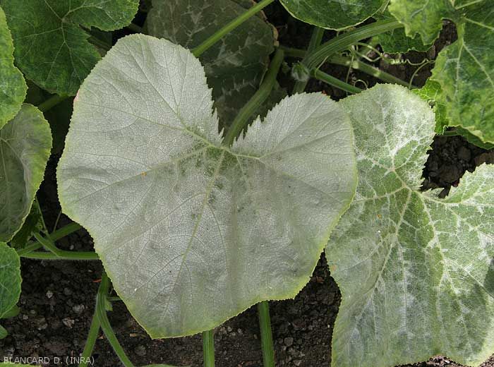 Argenture sur feuille de courge (à gauche feuille affectée, à droite feuille saine)