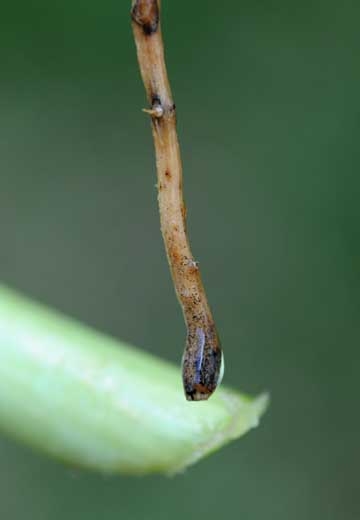 On this melon base, we can clearly see several chlorotic and withered leaves. <i> <b> Phomopsis sclerotioides </b> </i> (black root rot)