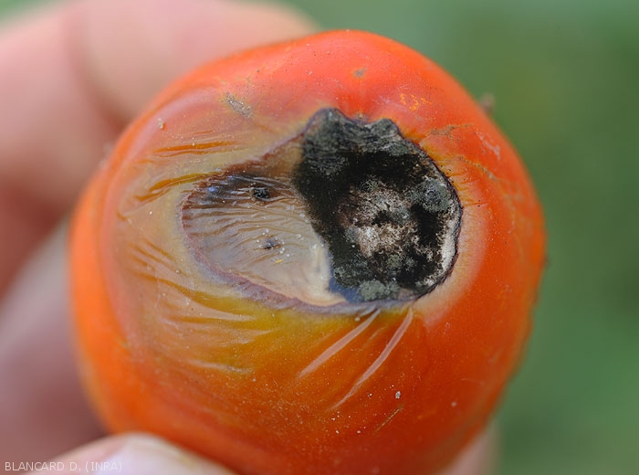 The stalk zone of these two tomato fruits shows more or less extensive and concave spots blackening in their center.  <i> <b> Alternaria tenuis </b> </i> ...