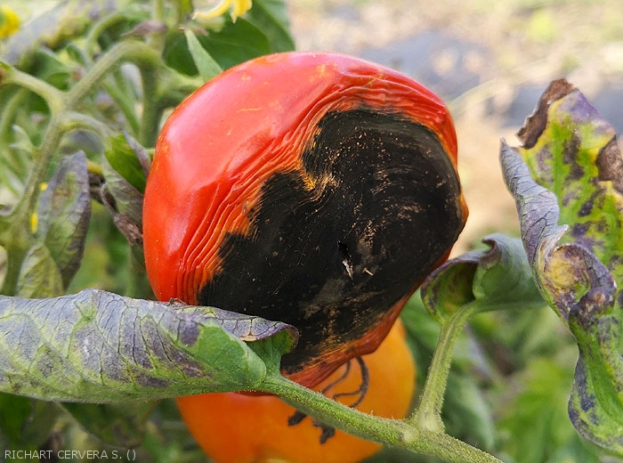 <b> <i> Alternaria </i> sp. </b> settling on a tomato fruit from slits in the stalk area and giving nearby tissues a black coloration.