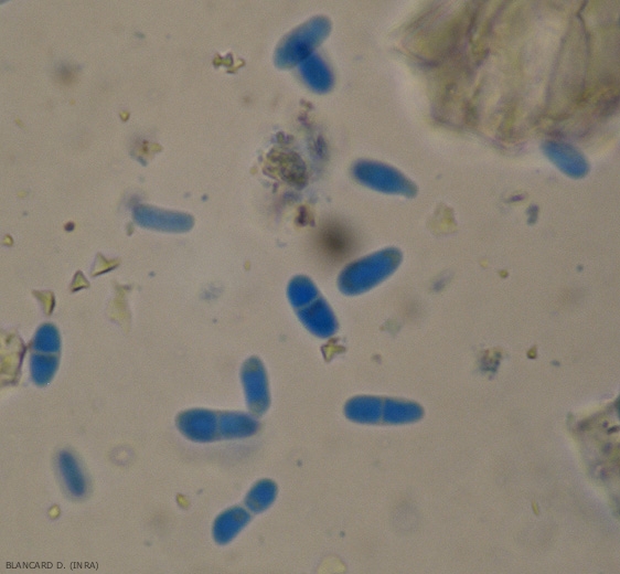 The pycnospores are smooth and hyaline, oblong to ellipsoid, even obovoid, uni or bicellular.  Their dimensions vary from one conidium to another (3-11 x 2-4.5 µm).  <b> <i> Didymella lycopersici </i> </b> (<i> Didymella </i> canker, <i> Didymella </i> stem canker and fruit rot)