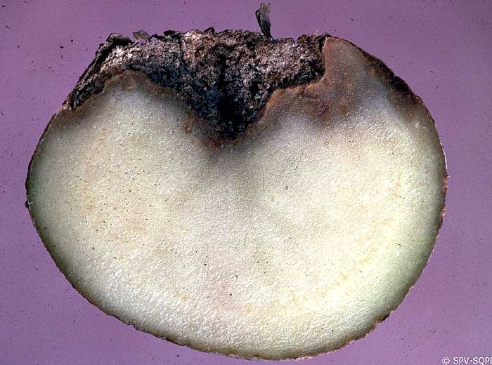 When the tuber is cut open, the underlying rotten tissues have a grainy, spongy/mealy appearance (photos 2 and 3).