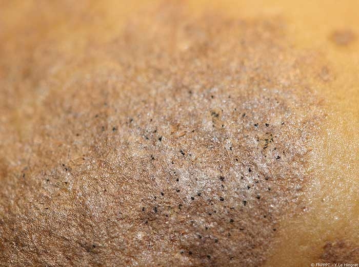 Lesions on tubers caused by fungal infection can be observed (photos 3 and 4): irregular and diffuse light to dark greyish surface areas with or without the formation of fructifications (microsclerotia) with setae when tubers are exposed to moisture (photos 5 and 6). Fructifications due to black dot (microsclerotia) are larger than for silver scurf (conidiophores) (photo 7).