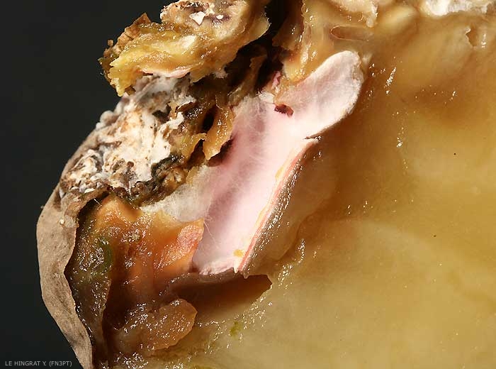 When cut in half, the tuber reveals a brown rot which develops into the flesh, with an unclear limit between healthy and infected areas, and with the potential presence of internal cavities covered with mycelium (photos 3 and 4). The tuber may dry out gradually, eventually becoming hard and mummified.