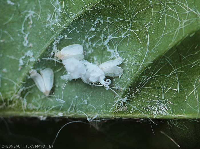 - The adults resemble almost entirely white midges, about 1 to 3 mm long depending on the species, and are mostly found on young leaves. The larvae, flattened, have an oval shape and are whitish or dark in color, covered or not with white waxy secretions depending on the species, which allows them to be recognized. However, the color of the larvae can change if they are parasitized by microhymenoptera. These larvae can be confused with mealybugs, but these are rare on vegetable crops and we will not observe "white flies" in this case.