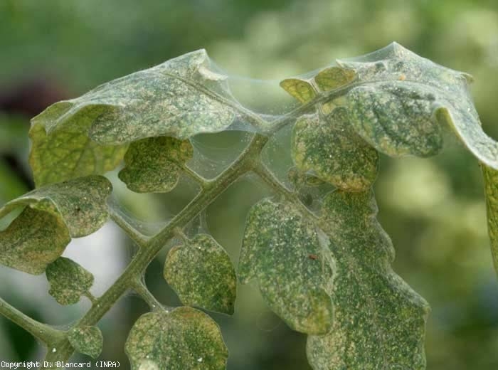 De minuscules taches chlorotiques plus ou moins dispersées sur le limbe des folioles de tomate (figures 3 et 4). Ce dernier jaunit progressivement et prend une teinte terne. Lors d'attaques sévères, certaines feuilles peuvent jaunir, flétrir et se dessécher . De délicates toiles soyeuses sont visibles au sein du couvert végétal (figure 5).