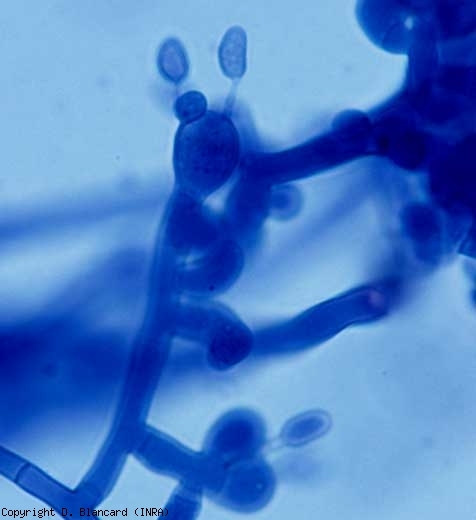 During 2004, rot outbreaks very occasionally affected the plant cover of an industrial tomato plantation in the south-west of France. All the aerial organs were more or less decomposed. Affected tissues rotted abruptly as a result of wet lesions rapidly invading the leaves. Wet and brown alterations gradually developed on sections of the stem and eventually surrounded them (Figure 1). A dense, whitish felting covered them. The tissues of the stem cortex would eventually be completely rotten and fall apart .