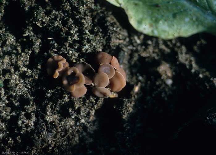 The teleomorphic (perfect) form of these fungi is sometimes visible on the soil surface, mainly in the case of Sclerotinia sclerotiorum . It is materialized by the formation of small "trumpets", apothecia (figure 14), especially on the largest sclerotia. These apothecia produce ascospores, at the origin of airborne contaminations.