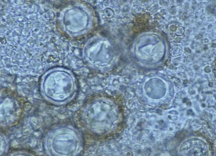 The oospores (figure 3) seem to be able to germinate and directly contaminate the young seedlings in the nursery. The sporangia , which have a lifespan of 6 days, provide the vast majority of contaminations, this in a few hours. They germinate in the presence of free water and emit a germ tube on the surface of the leaves which directly penetrates the cuticle and epidermal cells. Contaminations via the stomata are possible. The formation of zoospores is said to be quite rare. Infection can take 3 hours. Then the mycelium gradually invades the cells of the mesophyll. Its extension can be inter and intracellular. If the climatic conditions are favorable, yellow spots appear 4 to 7 days after the first contaminations. Bremia lactucae could be systemic and invade salads entirely.