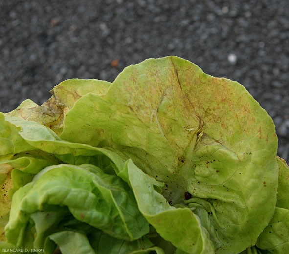 Plants affected by Golovinomyces cichoracearum var. cichoracearum show very characteristic symptoms regardless of the age of the plants (Figures 1 and 2). A grayish-white, powdery felting first appears as spots on the upper surfaces of old leaves (Figures 3-6). These gradually extend and merge to cover a more or less important portion of the limbus (figure 2). Spots are sometimes visible under the blade. The affected tissues are often chlorotic and show brown lesions (Figure 6), irregular, following the death of plant cells.