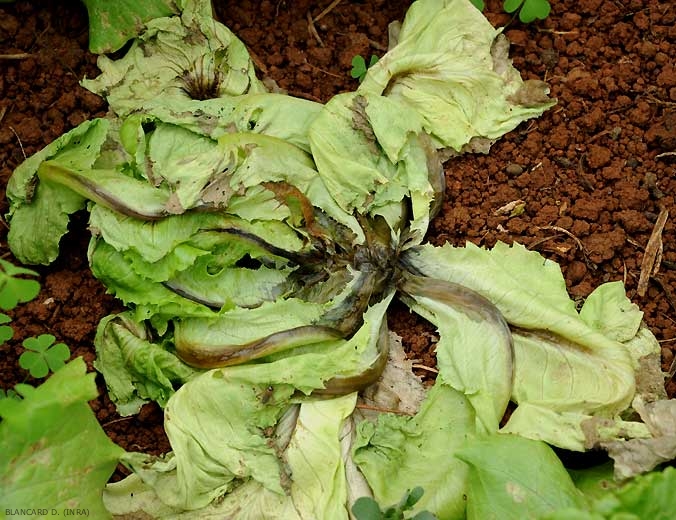Des effondrements assez brusques de salades sont parfois observés à la suite de périodes pluvieuses ou dans des parcelles trop irriguées, à proximité de la récolte. Ils sont provoqués par la colonisation des tissus internes des salades par des bactéries très polyphages appartenant au genre Pectobacterium et, plus particulièrement, à l'espèce Pectobacterium carotovorum subsp. carotovorum.