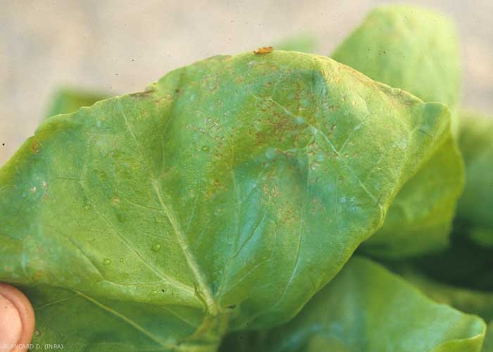 Il convient d'être particulièrement vigilant lorsque l'on est confronté à des taches sur feuilles de salade. En effet, il faut être conscient que leurs tissus foliaires sont tendres et fragiles, surtout lorsque les salades sont cultivées sous abris. Aussi, certains produits (pesticides surtout) posent des problèmes de sélectivité lorsqu'ils sont utilisés dans certaines conditions et s'avèrent phytotoxiques pour les salades. Diverses altérations nécrotiques peuvent alors apparaître sur les feuilles (figures 1 à 3). Celles-ci peuvent être confondues avec certaines taches que nous avons décrites dans cette partie. Lorsque vous aurez le moindre doute, nous vous conseillons de faire compléter votre diagnostic par un laboratoire spécialisé. Pour plus d'informations sur les phytotoxicités, nous vous suggérons de consulter les thèmes "phytotoxicités diverses" des fiches Feuilles déformées et Feuilles chlorotiques ou jaunes.