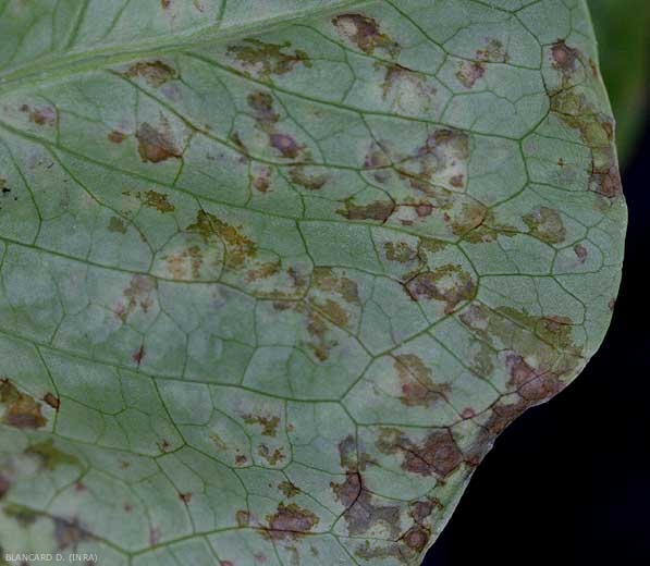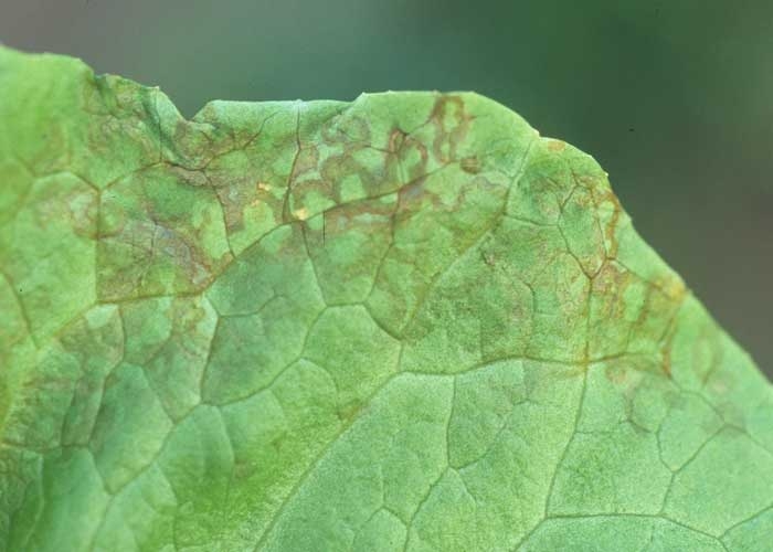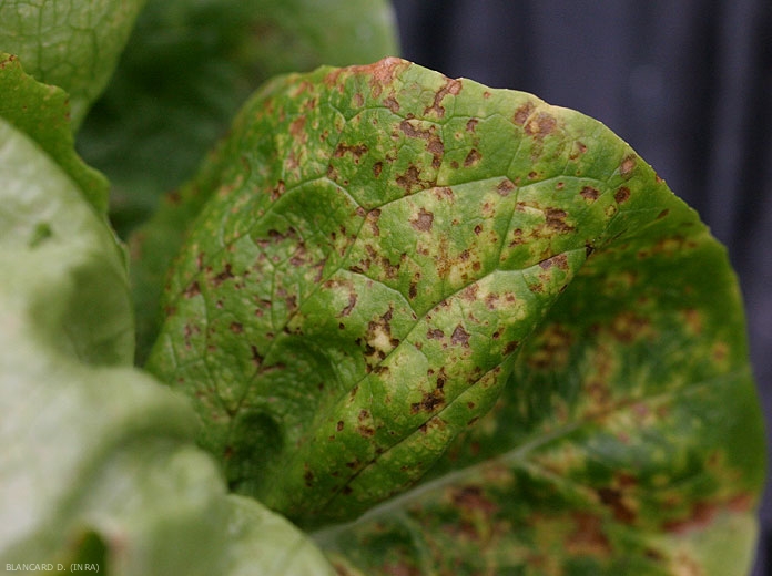 On butter lettuce, yellow spots, punctate or angular, appear initially, sometimes giving the upper surface of the leaf a marbled appearance (Figures 7 to 11). Rings, orange spots may also develop.